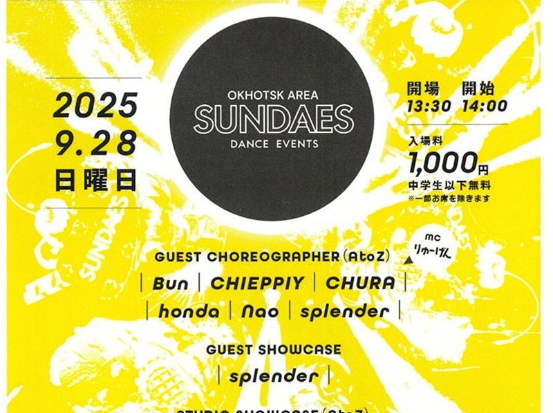 【2025.9.28開催】オホーツクエリア ダンスイベント SUNDAES※終了しました 日付 2025年9月28日(日) 時間 開場 13時30分開始 14時00分 場所 大ホール 入場料 1000円※中学生以下無料 続きを読む