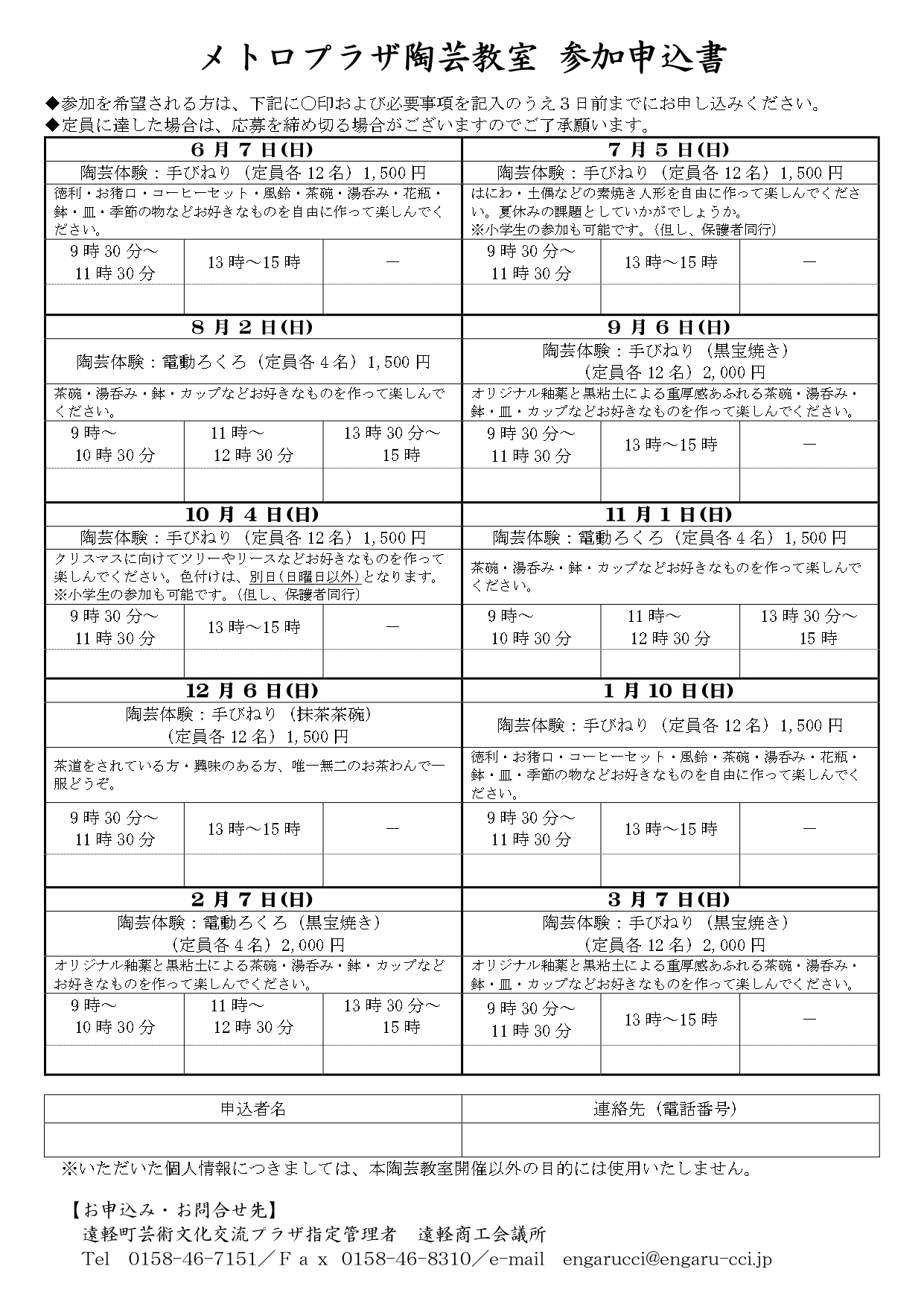令和8年度 陶芸教室のお知らせ 令和8年6月~令和9年3月まで、月1回行います。 参加を希望される方はご連絡ください。 何度でも参加可能ですので、複数日予約していただいても構いません。 また、定員に達した場合は応募を締め切る場合がございますのでご了承願います。 日時日時はチラシを参照ください。場所多目的室2参加費1500円 または 2000円お問合せ0158-46-7151(メトロプラザ受付) 令和8年度陶芸教室ダウンロード シェア: Facebook で共有 (新しいウィンドウで開きます) Facebook X で共有 (新しいウィンドウで開きます) X